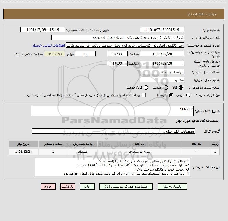 نام دستگاه خریدار:شرکت پالایش گاز شهید هاشمی نژاد استان خراسان رضوی