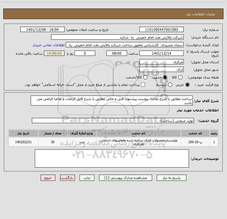 شرح کلی نیاز: ساخت مطابق با شرح تقاضا- پیوست پیشنهاد فنی و مالی مطابق با شرح فایل الزامات و تقاضا الزامی می باشد