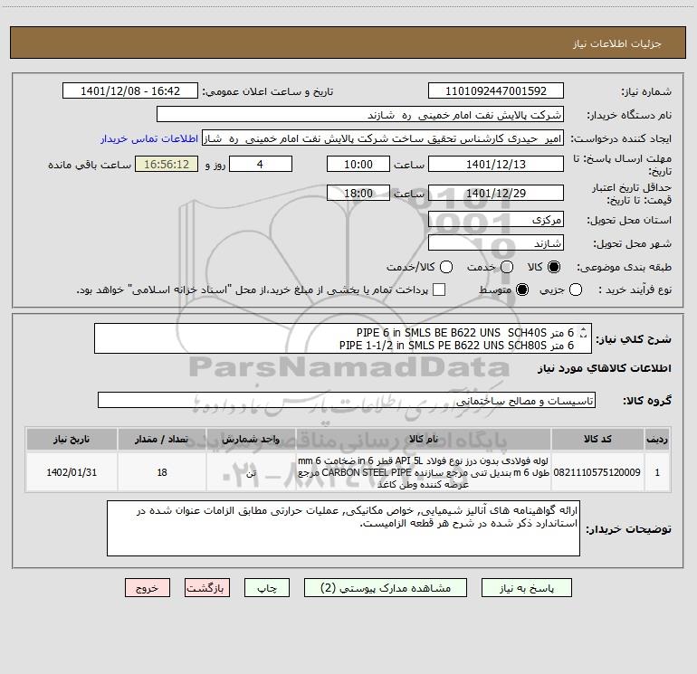 استعلام 6 متر PIPE 6 in SMLS BE B622 UNS SCH40S 6 متر PIPE 1-1/2 in SMLS PE B622 UNS SCH80S 6 متر PIPE 1 in SMLS PE B622 UNS SCH80S, استعلام 6 متر PIPE 6 in SMLS BE B622 UNS SCH40S 6 متر PIPE 1-1/2 in SMLS PE B622 UNS SCH80S 6 متر PIPE 1 in SMLS PE B622 UNS SCH80S