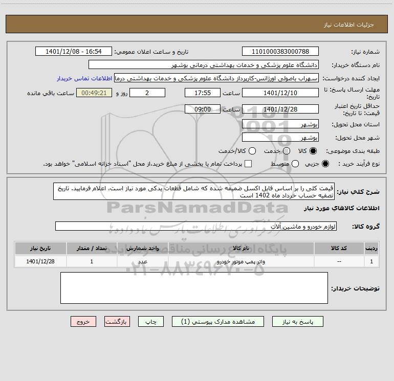 شرح کلی نیاز: قیمت کلی را بر اساس فایل اکسل ضمیمه شده که شامل قطعات یدکی مورد نیاز است، اعلام فرمایید. تاریخ تصفیه حساب خرداد ماه 1402 است