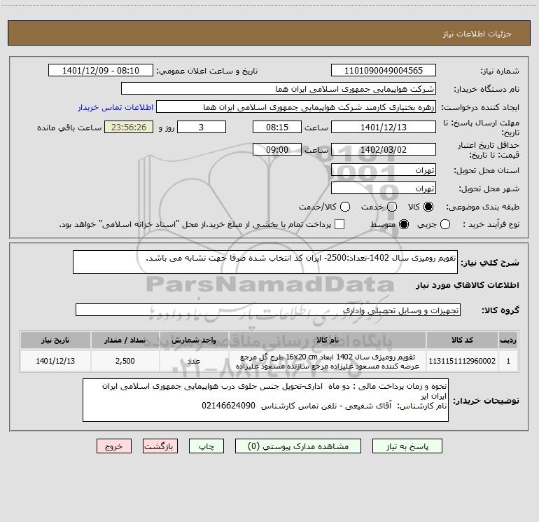 شرح کلی نیاز: تقویم رومیزی سال 1402-تعداد:2500- ایران کد انتخاب شده صرفا جهت تشابه می باشد.