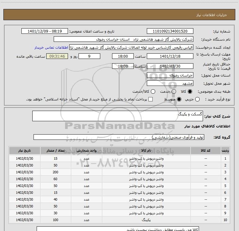 نام دستگاه خریدار:شرکت پالایش گاز شهید هاشمی نژاد استان خراسان رضوی