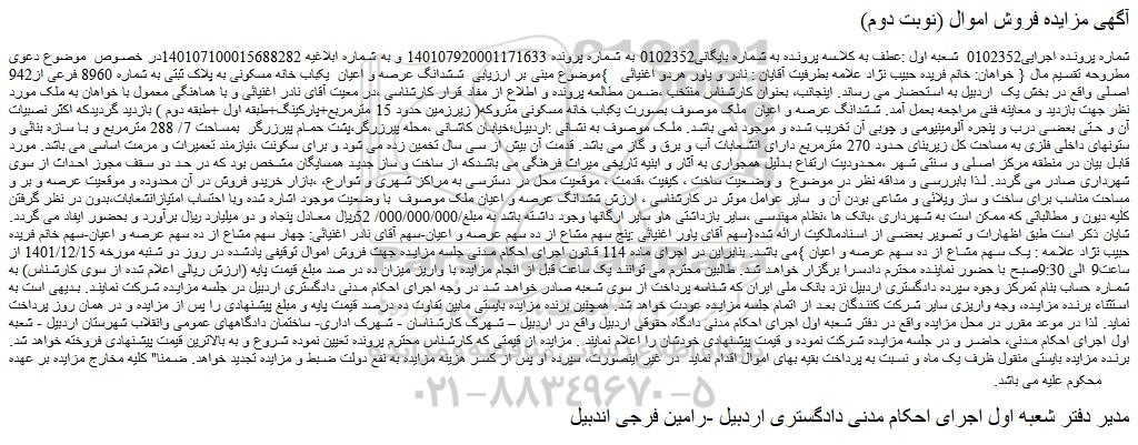 شماره پرونده اجرایی0102352  شعبه اول :عطف به کلاسه پرونده به شماره بایگانی0102352 به شماره پرونده 140107920001171633 و به شماره ابلاغیه 140107100015688282در خصوص  موضوع دعوی مطروحه تقسیم مال { خواهان: خانم فریده حبیب نژاد علامه بطرفیت آقایان : نادر و یاور هردو اغنیائی   }موضوع مبنی بر ارزیابی  ششدانگ عرصه و اعیان  یکباب خانه مسکونی به پلاک ثبتی به شماره 8960 فرعی از942 اصلی واقع در بخش یک  اردبیل به استحضار می رساند. اینجانب، بعنوان کارشناس منتخب ،ضمن مطالعه پرونده و اطلاع از مفاد قرار کارشناسی ،در معیت آقای نادر اغنیائی و با هماهنگی معمول با خواهان به ملک مورد نظر جهت بازدید و معاینه فنی مراجعه بعمل آمد. ششدانگ عرصه و اعیان  ملک موصوف بصورت یکباب خانه مسکونی متروکه( زیرزمین حدود 15 مترمربع+پارکینگ+طبقه اول +طبقه دوم ) بازدید گردیدکه اکثر نصبیات آن و حتی بعضی درب و پنجره آلومینیومی و چوبی آن تخریب شده و موجود نمی باشد. ملک موصوف به نشانی :اردبیل؛خیابان کاشانی ،محله پیرزرگر،پشت حمام پیرزرگر  بمساحت 7/ 288 مترمربع و با سازه بنائی و ستونهای داخلی فلزی به مساحت کل زیربنای حدود 270 مترمربع دارای انشعابات آب و برق و گاز می باشد. قدمت آن بیش از سی سال تخمین زده می شود و برای سکونت ،نیازمند تعمیرات و مرمت اساسی می باشد. مورد قابل بیان در منطقه مرکز اصلی و سنتی شهر ،محدودیت ارتفاع بدلیل همجواری به آثار و ابنیه تاریخی میراث فرهنگی می باشدکه از ساخت و ساز جدید همسایگان مشخص بود که در حد دو سقف مجوز احداث از سوی شهرداری صادر می گردد. لذا بابررسی و مداقه نظر در موضوع  و وضعیت ساخت ، کیفیت ،قدمت ، موقعیت محل در دسترسی به مراکز شهری و شوارع، ،بازار خریدو فروش در آن محدوده و موقعیت عرصه و بر و مساحت مناسب برای ساخت و ساز ویلائی و مشاعی بودن آن و  سایر عوامل موثر در کارشناسی ، ارزش ششدانگ عرصه و اعیان ملک موصوف  با وضعیت موجود اشاره شده وبا احتساب امتیازانشعابات،بدون در نظر گرفتن کلیه دیون و مطالباتی که ممکن است به شهرداری ،بانک ها ،نظام مهندسی ،سایر بازداشتی هاو سایر ارگانها وجود داشته باشد به مبلغ/000/000/000/ 52ریال معادل پنجاه و دو میلیارد ریال برآورد و بحضور ایفاد می گردد. شایان ذکر است طبق اظهارات و تصویر بعضی از اسنادمالکیت ارائه شده{سهم آقای یاور اغنیائی :پنج سهم مشاع از ده سهم عرصه و اعیان-سهم آقای نادر اغنیائی: چهار سهم مشاع از ده سهم عرصه و اعیان-سهم خانم فریده حبیب نژاد علامه : یک سهم مشاع از ده سهم عرصه و اعیان }می باشد. بنابراین در اجرای ماده 114 قانون اجرای احکام مدنی جلسه مزایده جهت فروش اموال توقیفی یادشده در روز دو شنبه مورخه 1401/12/15 از ساعت9 الی 9:30صبح با حضور نماینده محترم دادسرا برگزار خواهد شد. طالبین محترم می توانند یک ساعت قبل از انجام مزایده با واریز میزان ده در صد مبلغ قیمت پایه (ارزش ریالی اعلام شده از سوی کارشناس) به شماره حساب بنام تمرکز وجوه سپرده دادگستری اردبیل نزد بانک ملی ایران که شناسه پرداخت از سوی شعبه صادر خواهد شد در وجه اجرای احکام مدنی دادگستری اردبیل در جلسه مزایده شرکت نمایند. بدیهی است به استثناء برنده مزایده، وجه واریزی سایر شرکت کنندگان بعد از اتمام جلسه مزایده عودت خواهد شد. همچنین برنده مزایده بایستی مابین تفاوت ده درصد قیمت پایه و مبلغ پیشنهادی را پس از مزایده و در همان روز پرداخت نماید. لذا در موعد مقرر در محل مزایده واقع در دفتر شعبه اول اجرای احکام مدنی دادگاه حقوقی اردبیل واقع در اردبیل – شهرک کارشناسان - شهرک اداری- ساختمان دادگاههای عمومی وانقلاب شهرستان اردبیل - شعبه اول اجرای احکام مدنی، حاضر و در جلسه مزایده شرکت نموده و قیمت پیشنهادی خودشان را اعلام نمایند . مزایده از قیمتی که کارشناس محترم پرونده تعیین نموده شروع و به بالاترین قیمت پیشنهادی فروخته خواهد شد. برنده مزایده بایستی منقول ظرف یک ماه و نسبت به پرداخت بقیه بهای اموال اقدام نماید  در غیر اینصورت، سپرده او پس از کسر هزینه مز
