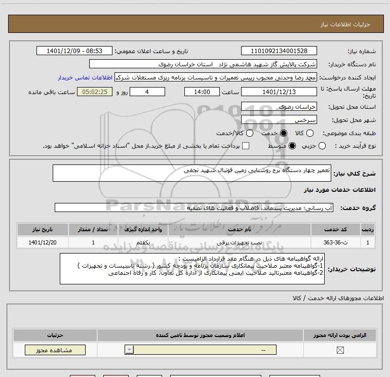 شرح کلی نیاز: تعمیر چهار دستگاه برج روشنایی زمین فوتبال شهید نجفی
