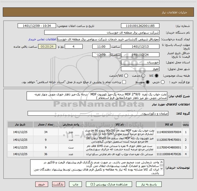 استعلام تخت خواب یک نفره 9/0*2 MDF درجه یک-میز تلویزیون MDF درجه یک-میز ناهار خوری چوبی چهار نفره-صندلی چوبی دور میز ناهار خوری(مطابق فرم استعلام ), استعلام تخت خواب یک نفره 9/0*2 MDF درجه یک-میز تلویزیون MDF درجه یک-میز ناهار خوری چوبی چهار نفره-صندلی چوبی دور میز ناهار خوری(مطابق فرم استعلام )