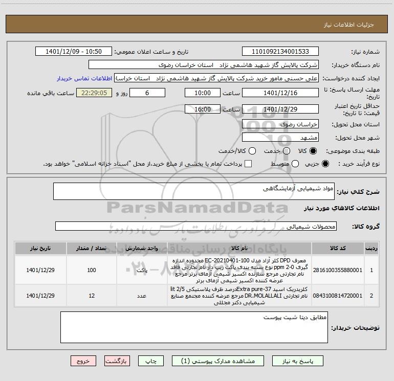 نام دستگاه خریدار:شرکت پالایش گاز شهید هاشمی نژاد استان خراسان رضوی