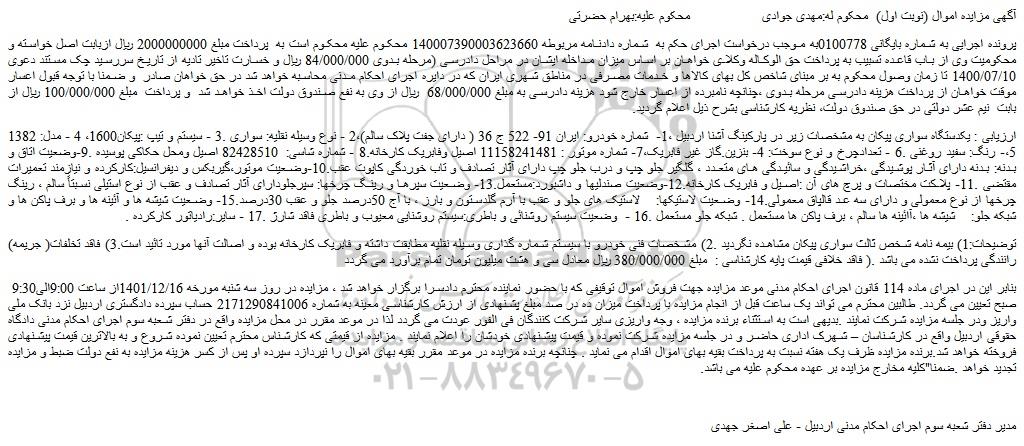 آگهی مزایده اموال (نوبت اول)  محکوم له:مهدی جوادی                  محکوم علیه:بهرام حضرتی