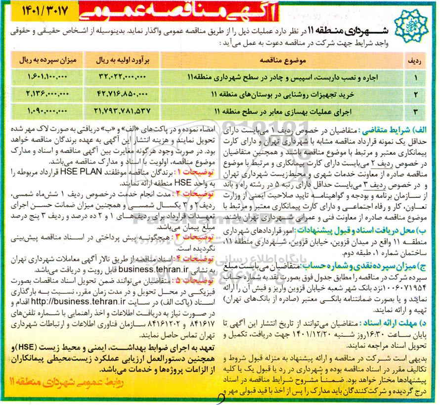 شهرداری منطقه 11 در نظر دارد عملیات ذیل را از طریق مناقصه عمومی واگذار نماید. بدینوسیله از شرکتهای واجد شرایط جهت شرکت در مناقصه دعوت بعمل می آید:
