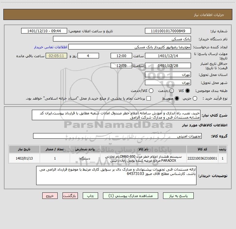 شرح کلی نیاز: خرید، نصب، راه اندازی و آموزش سامانه اعلام خطر صندوق امانات شعبه مطابق با قرارداد پیوست.ایران کد مشابه.مستندات فنی و مدارک شرکت الزامی