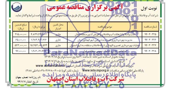 شرکت آب و فاضلاب استان اصفهان در نظر دارد عملیات اجرایی به شرح زیر را از طریق مناقصه عمومی به پیمانکاران واجد شرایط واگذار نماید.