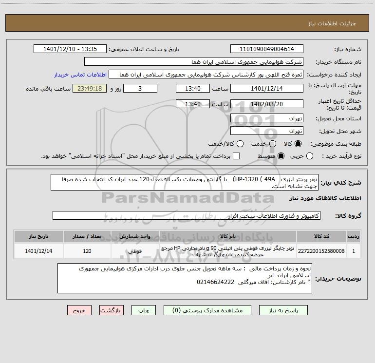 شرح کلی نیاز: تونر پرینتر لیزری HP-1320 ( 49A) با گارانتی وضمانت یکساله،تعداد120 عدد ایران کد انتخاب شده صرفا جهت تشابه است.