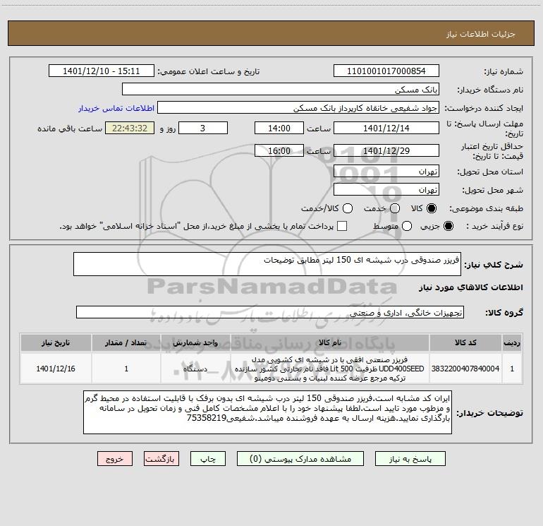 توضیحات خریدار:ایران کد مشابه است.فریزر صندوقی 150 لیتر درب شیشه ای بدون برفک با قابلیت استفاده در محیط گرم و مزطوب مورد تایید است.لطفا پیشنهاد خود را با اعلام مشخصات کامل فنی و زمان تحویل در سامانه بارگذاری نمایید.هزینه ارسال به عهده فروشنده میباشد.شفیعی75358219