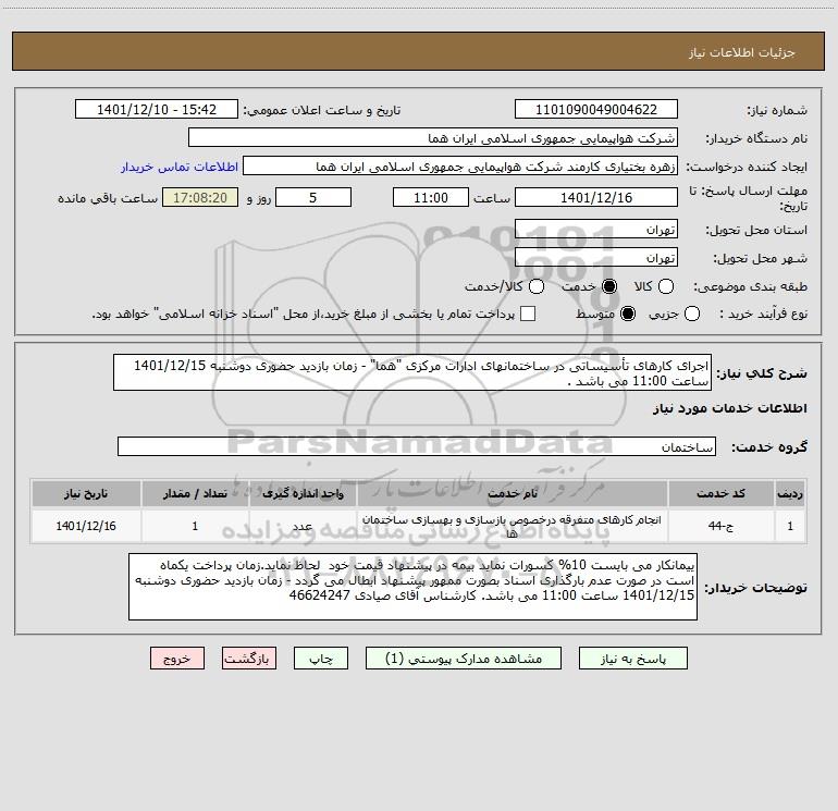 شرح کلی نیاز: اجرای کارهای تأسیساتی در ساختمانهای ادارات مرکزی "هما" - زمان بازدید حضوری دوشنبه 1401/12/15 ساعت 11:00 می باشد .