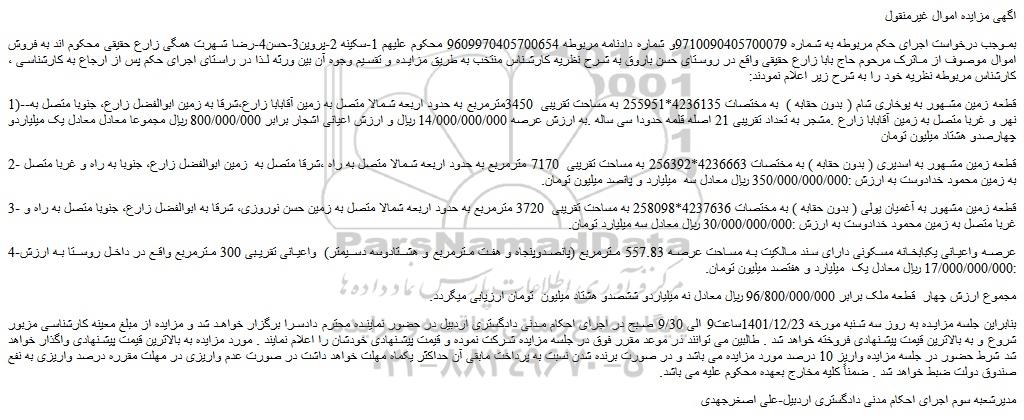 بموجب درخواست اجرای حکم مربوطه به شماره 9710090405700079و شماره دادنامه مربوطه 9609970405700654 محکوم علیهم 1-سکینه 2-پروین3-حسن4-رضا شهرت همگی زارع حقیقی محکوم اند به فروش اموال موصوف از ماترک مرحوم حاج بابا زارع حقیقی واقع در روستای حسن باروق به شرح نظریه کارشناس منتخب به طریق مزایده و تقسیم وجوه آن بین ورثه لذا در راستای اجرای حکم پس از ارجاع به کارشناسی ، کارشناس مربوطه نظریه خود را به شرح زیر اعلام نمودند: