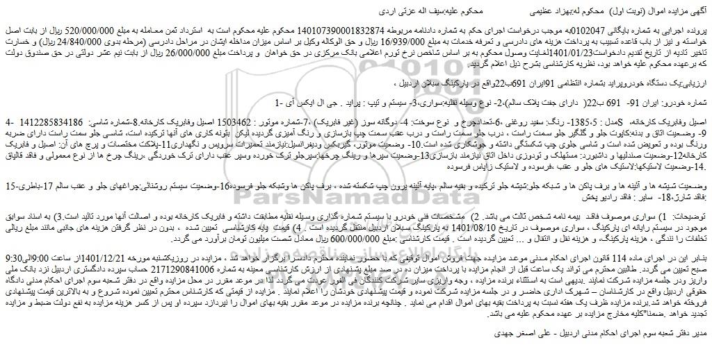 توضیحات:  1) سواری موصوف فاقد  بیمه نامه شخص ثالث می باشد. 2)  مشخصات فنی خودرو با سیستم شماره گذاری وسیله نقلیه مطابقت داشته و فابریک کارخانه بوده و اصالت آنها مورد تائید است.3) به اسناد سوابق موجود در سیستم رایانه ای پارکینگ ، سواری موصوف در تاریخ 1401/08/10 به پارکینگ سبلان اردبیل منتقل گردیده است . 4) قیمت  پایه کارشناسی  تعیین شده  ، بدون در نظر گرفتن هزینه های جانبی مانند مبلغ ریالی تخلفات را نندگی ، هزینه پارکینگ، و هزینه نقل و انتقال و ... تعیین گردیده است . قیمت کارشناسی :مبلغ 600/000/000 ریال معادل شصت میلیون تومان برآورد می گردد.