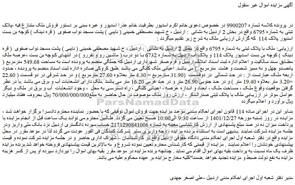 در پرونده کلاسه شماره 9900207 در خصوص دعوی خانم اکرم اسدپور بطرفیت خانم عذرا اسدپور و غیره مبنی بر دستور فروش ملک متنازع فیه ،پلاک ثبتی به شماره 6795 واقع در بخش 2 اردبیل به نشانی  : اردبیل ، خ شهید مصطفی خمینی ( نایبی ) پشت مسجد نواب صفوی  ( قره دینک ) کوچه بن بست اسدپور پلاک 114  که گزارش ارزیابی ملک به شرح زیر تقدیم میگردد :