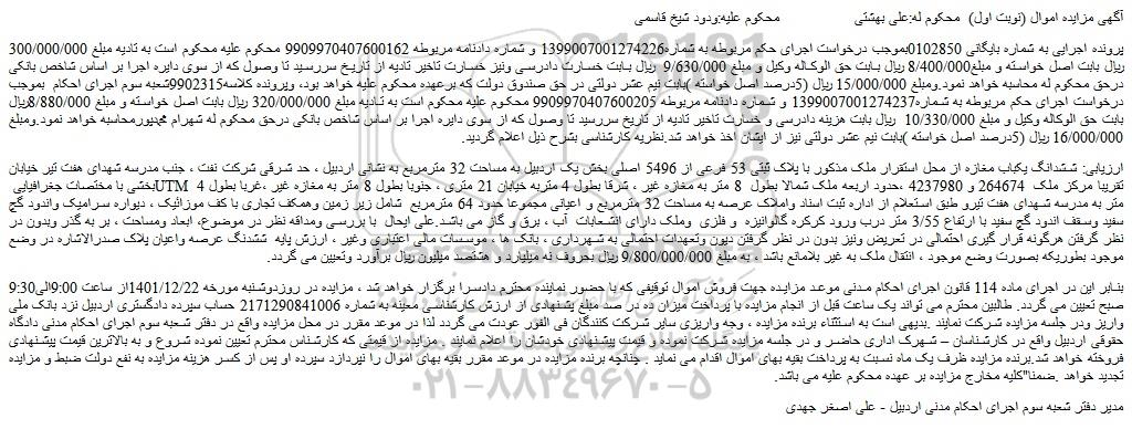 آگهی مزایده اموال (نوبت اول) محکوم له:علی بهشتی محکوم علیه:ودود شیخ قاسمی