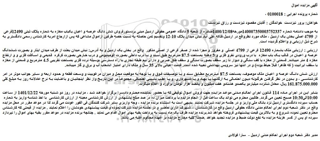 به موجب دادنامه شماره 140007350003752337مورخه1400/12/08صادره از شعبه 5 دادگاه عمومی حقوقی اردبیل مبنی بردستورفروش شش دانگ عرصه و اعیان یکباب مغازه به شماره پلاک ثبتی 12490فرعی از 4799 اصلی بخش یک اردبیل ، ملک مورد نظرواقع در اردبیل-فلکه علی آباد نبش میدان پلاک 10-12 وتقسیم ثمن حاصله به نسبت حصه طرفین ازاموال مشاعی که پس ازارجاع امربه کارشناس رسمی دادگستری به شرح ذیل ارزیابی و واعلام گردیده است.