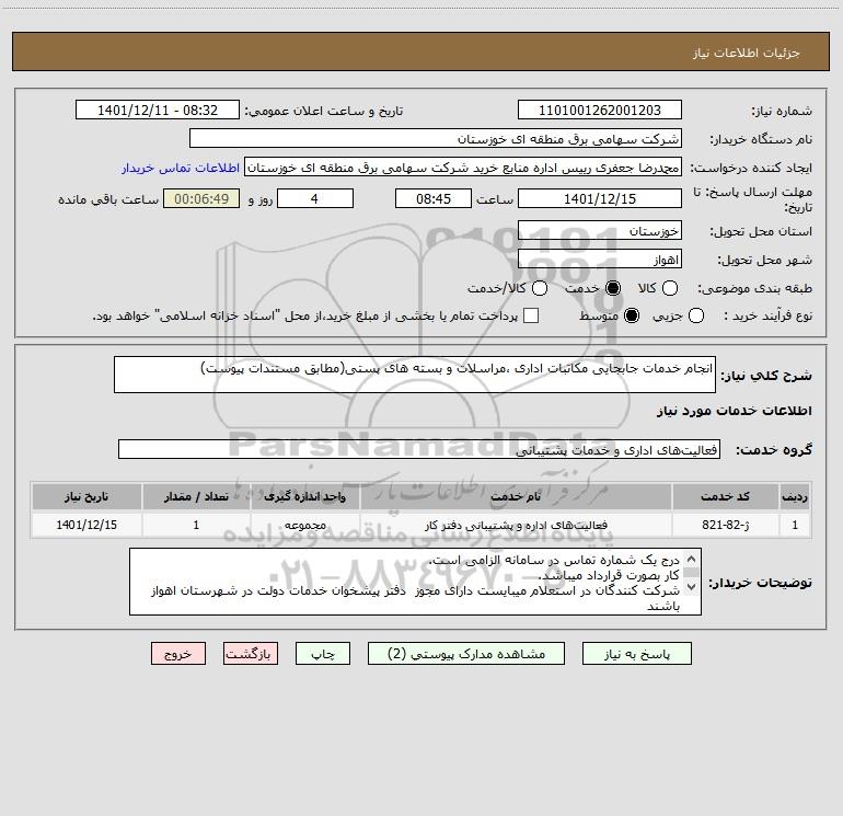 12 استعلام توزیع مرسولات پستی (اشخاص حقوقی) با حجم و کار مشخص 9801990 1404/08/14 new not special not payed خوزستان