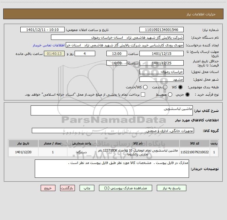 نام دستگاه خریدار:شرکت پالایش گاز شهید هاشمی نژاد استان خراسان رضوی