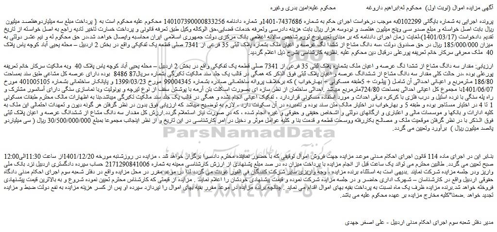 پرونده اجرایی به شماره بایگانی 0102299به موجب درخواست اجرای حکم به شماره 7437686-1401و شماره دادنامه 140107390000833256 محکوم علیه محکوم است به { پرداخت مبلغ سه میلیاردوهفتصد میلیون  ریال بابت اصل خواسته و مبلغ صدو سی وپنج میلیون هفتصد و نودوسه هزار ریال بابت هزینه دادرسی وتعرفه خدمات قضایی،حق الوکاله وکیل طبق تعرفه قانونی و پرداخت خسارت تاخیر تادیه راجع به اصل خواسته از تاریخ تقدیم دادخواست (1401/03/17)،لغایت زمان اجرای دادنامه که بر مبنای تغییرنرخ تورم شاخص سالانه اعلامی بانک مرکزی دولت جمهوری اسلامی ایران محاسبه وایصال خواهد شد،در حق محکوم له و نیم عشر دولتی به میزان 185/000/000 ریال در حق صندوق دولت ،سه دانگ مشاع از ششدا نگ عرصه و اعیان ملک بشماره پلاک ثبتی 35 فرعی از 7341 صلی قطعه یک تفکیکی واقع در بخش 2 اردبیل – محله یحیی آباد کوچه یاس پلاک 40  ملک معرفی سرکار خانم تعریفه پورعلی درقبال دین محکوم علیه .نظریه کارشناسی بشرح ذیل اعلام گردید.