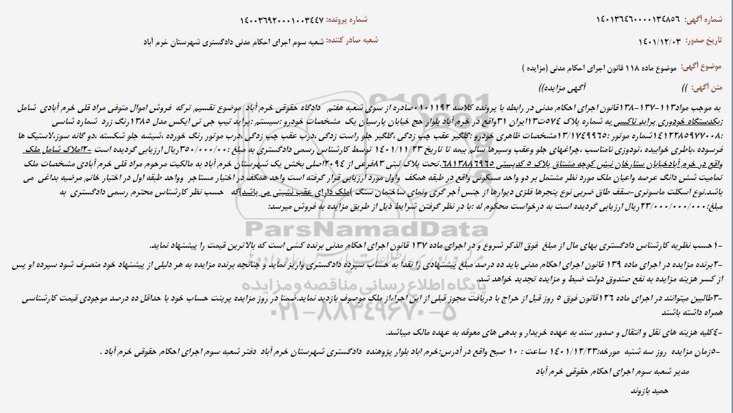 به موجب مواد113-137-138قانون اجرای احکام مدنی در رابطه با پرونده کلاسه 0101192صادره از سوی شعبه هفتم دادگاه حقوقی خرم آباد موضوع تقسیم ترکه فروش اموال متوفی مراد قلی خرم آبادی شامل :یکدستگاه خودوری پراید تاکسی به شماره پلاک 574ت13ایران 31واقع در خرم آباد بلوار حج خیابان پارسیان یک مشخصات خودرو :سیستم :پراید تیپ جی تی ایکس مدل 1385رنگ زرد شماره شاسی :1412285977008شماره موتور :13/1749965مشخصات ظاهری خودرو :گلگیر عقب چپ زدگی ،گلگیر جلو راست زدگی ،درب عقب چپ زدگی ،درب موتور رنگ خورده ،شیشه جلو شکسته ،دو گانه سوز،لاستیک ها فرسوده ،باطری خوابیده ،تودوزی نامناسب ،چراغهای جلو وعقب وسپرها سالم بیمه تا تاریخ 1401/11/23 توسط کارشناس رسمی دادگستری به مبلغ :350/000/00ریال ارزیابی گردیده است 2-املاک شامل ملک واقع در خرم آبادخیابان ستارخان نبش کوچه مشتاق پلاک 5 کدپستی 6813886965.تحت پلاک ثبتی 83فرعی از 2094اصلی بخش یک شهرستان خرم آباد به مالکیت مرحوم مراد قلی خرم آبادی مشخصات ملک تمامیت شش دانگ عرصه واعیان ملک مورد نظر مشتمل بر دو واحد مسکونی واقع در طبقه همکف واول مورد ارزیابی قرار گرفته است واحد همکف در اختیار مستاجر وواحد طبقه اول در اختیار خانم مرضیه بداغی می باشد.نوع اسکلت ماسونری-سقف طاق ضربی نوع پنجرها فلزی دیوارها از جنس آجر گری ونمای ساختمان سنگ (ملک دارای عقب نشینی می باشد)که حسب نظر کارشناس محترم رسمی دادگستری به مبلغ:23/000/000/000ریال ارزیابی گردیده است به درخواست محکوم له :با در نظر گرفتن شرایط ذیل از طریق مزایده به فروش میرسد: