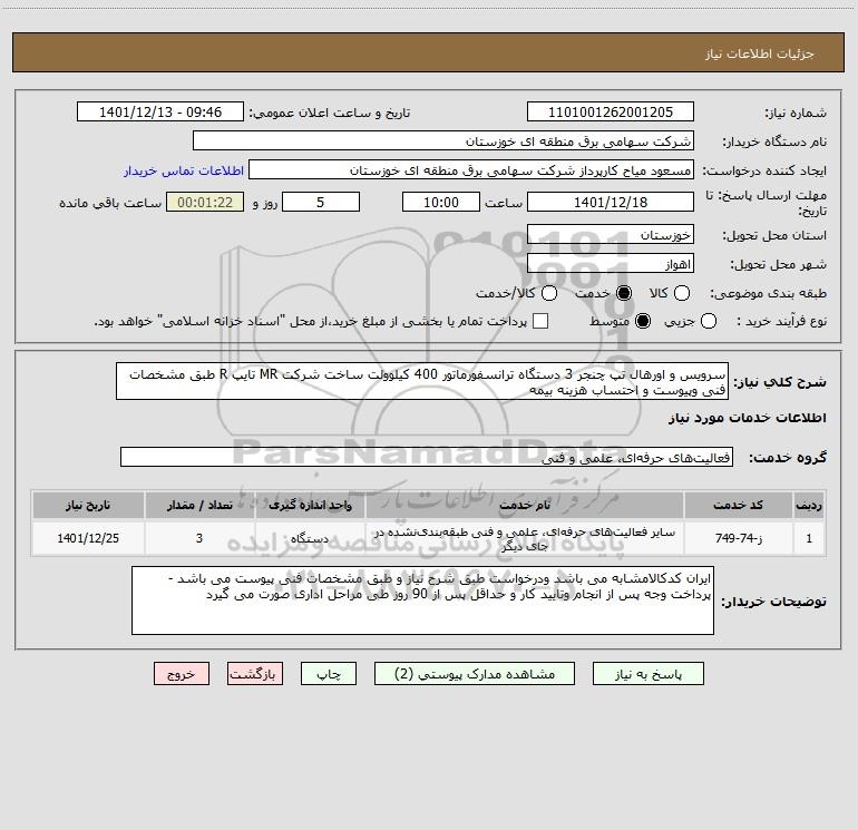 شرح کلی نیاز: سرویس و اورهال تپ چنجر 3 دستگاه ترانسفورماتور 400 کیلوولت ساخت شرکت MR تایپ R طبق مشخصات فنی وپیوست و احتساب هزینه بیمه