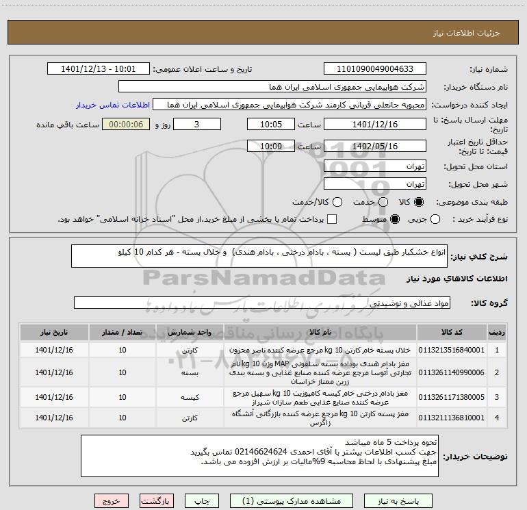 شرح کلی نیاز: انواع خشکبار طبق لیست ( پسته ، بادام درختی ، بادام هندی) و خلال پسته - هر کدام 10 کیلو