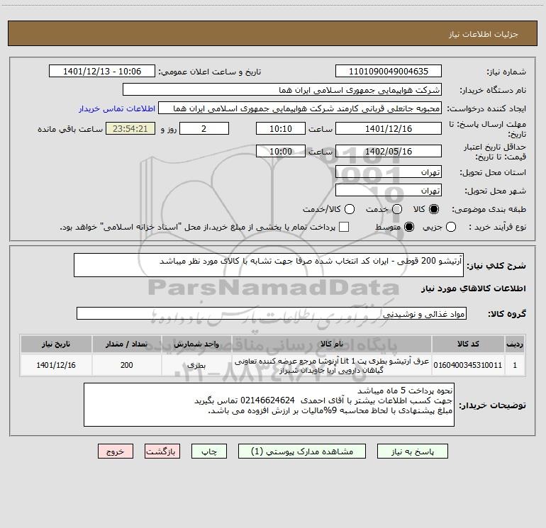 شرح کلی نیاز: آرتیشو 200 قوطی - ایران کد انتخاب شده صرفا جهت تشابه با کالای مورد نظر میباشد