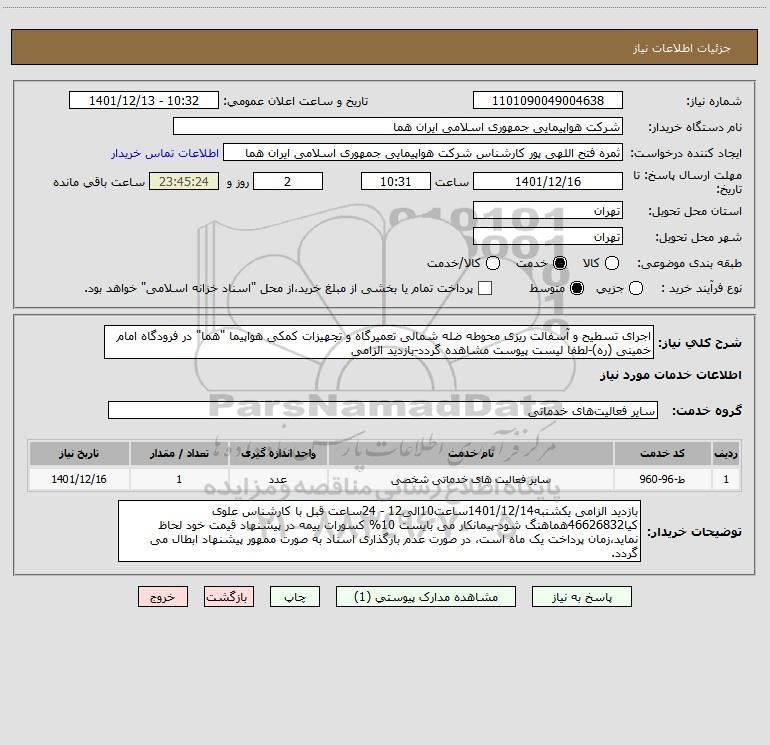 شرح کلی نیاز: اجرای تسطیح و آسفالت ریزی محوطه ضله شمالی تعمیرگاه و تجهیزات کمکی هواپیما "هما" در فرودگاه امام خمینی (ره)-لطفا لیست پیوست مشاهده گردد-بازدید الزامی