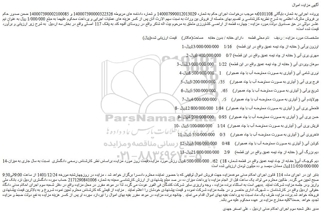 پرونده اجرایی به شماره بایگانی 0101108به موجب درخواست اجرای حکم به شماره 140007990012013029 و شماره دادنامه های مربوطه 140007390000322326 و 140007390002100085 ضمن صدور حکم بر فروش ماترک اعلامی به شرح نظریه کارشناسی و تقسیم بهای حاصله از فروش بین وراث به نسبت سهم الارث آنان پس از کسر هزینه های عملیات اجرایی و پرداخت محکوم علیهما به مبلغ 1/000/000 ریال به عنوان نیم عشر دولتی در حق صندوق دولت.مورد مزایده : چهارده قطعه از اراضی کشاورزی متعلق به مرحوم بیت اله شاکر واقع در روستای آقچه کند به پلاک 117 اصلی واقع در بخش سه اردبیل به شرح زیر ارزیابی و برآورد قیمت شده است؛