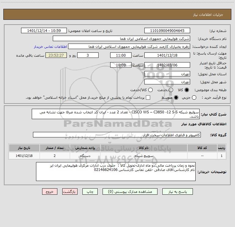 شرح کلی نیاز: سوئیچ شبکه CISCO WS – C3850 -12 S-S - تعداد 2 عدد - ایران کد انتخاب شده صرفا جهت تشابه می باشد.
