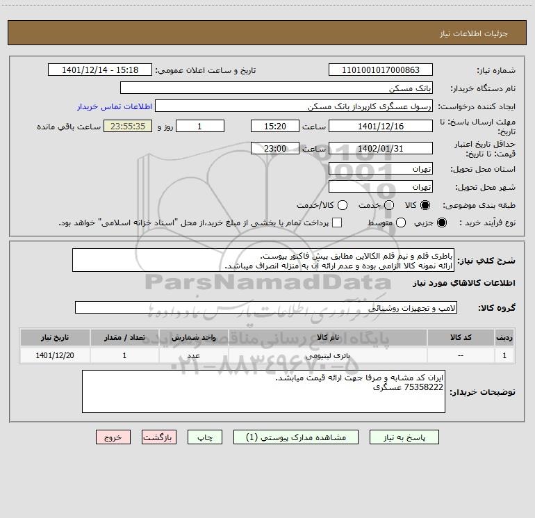 شرح کلی نیاز: باطری قلم و نیم قلم الکالاین مطابق پیش فاکتور پیوست.
