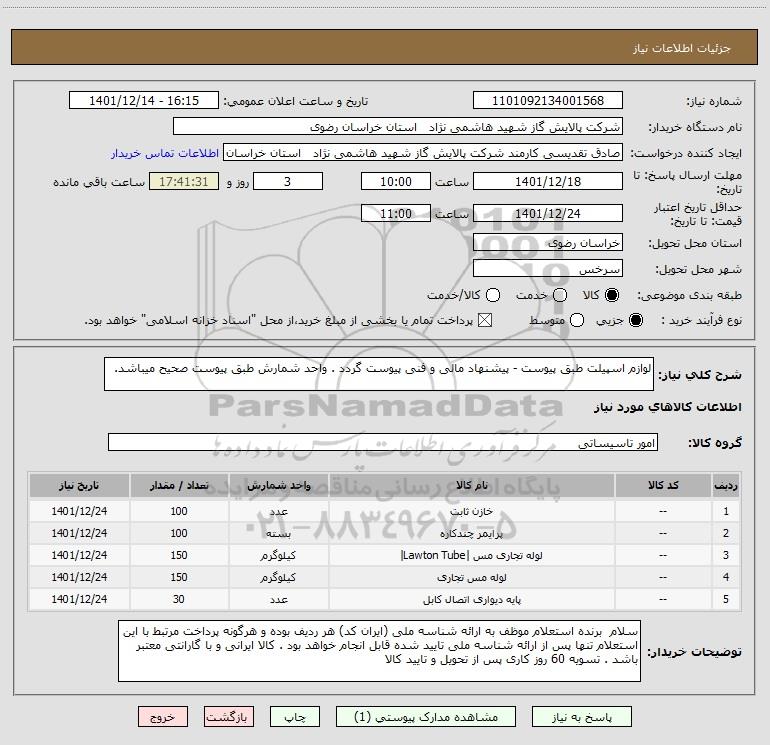 نام دستگاه خریدار:شرکت پالایش گاز شهید هاشمی نژاد استان خراسان رضوی