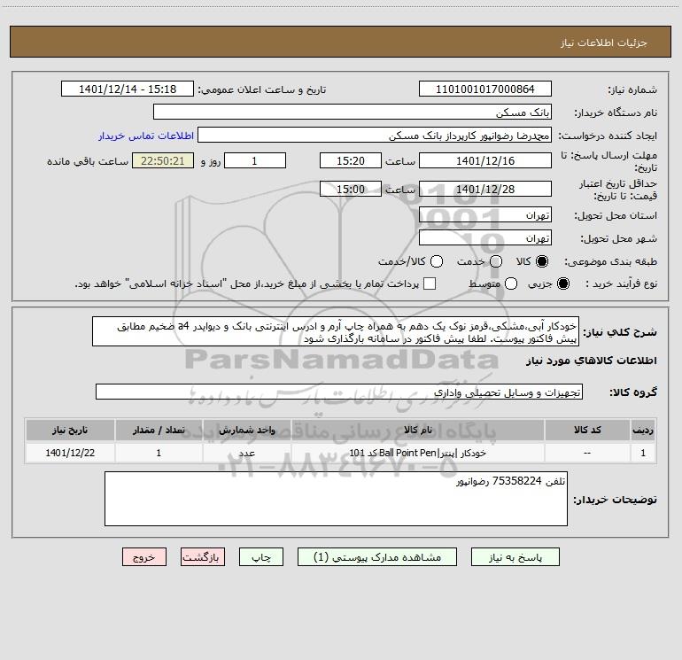 شرح کلی نیاز: خودکار آبی،مشکی،قرمز نوک یک دهم به همراه چاپ آرم و ادرس اینترنتی بانک و دیوایدر a4 ضخیم مطابق پیش فاکتور پیوست. لطفا پیش فاکتور در سامانه بارگذاری شود