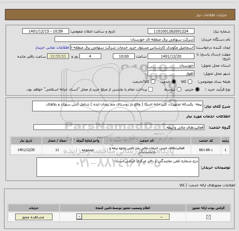 شرح کلی نیاز: بیمه یکساله تجهیزات کلیدخانه اندیکا ( واقع در روستای چم ریحان ایذه ) شامل آتش سوزی و بلاهای