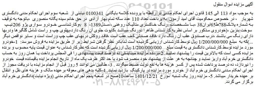 به موجب مواد 113 الی 145 قانون اجرای احکام مدنی در رابطه با پرونده کلاسه بایگانی 0100341 نیابتی از شعبه سوم اجرای احکام مدنی دادگستری شهریار ، در خصوص محکومیت آقای امید آرمون به پرداخت تعداد 110 عدد سکه تمام بهار آزادی در حق خانم سیده یگانه منصوری ،باتوجه به توقیف وکارشناسی خودرو سواری پژو 206تیپ v8 به شماره پلاک788ط65ایران38 ،با مشخصات :رنگ خاکستری متالیک روغنی ،،مدل1389، سوخت:بنزین ،(خودروی مذکور بر اساس نظریه کارشناس ظاهرا دورنگ میباشد ،کاپوت جلوی آن رنگ دارد،پهلوی چپ و راست شامل گلگیرها ودربها دارای رنگ می باشند ،درب صندوق عقب آن رنگ دارد ،فاقد صندلی کف عقب است ،فاقد روکش دربهای عقب چپ وراست است و سایر نواقص دیگر ...)که به مبلغ 1/200/000/000 ریال توسط کارشناس ارزیابی گردیده است لذابادر نظر گرفتن شرایط زیر از طریق مزایده به فروش میرسد: 1-خودرو مورد مزایده توسط کارشناس دادگستری به قیمت مبلغ 1/200/000/000 ریال ارزیابی گردیده است که نظرکارشناس به عنوان قیمت پایه محسوب و برنده مزایده کسی است که بالاترین قیمت را پیشنهاد نمایید. 2-برنده مزایده میبایستی ده درصد قیمت پیشنهادی را فی المجلس پرداخت یا همان روز به حساب دادگستری خرم آباد واریز نماید و چنانچه به هر علت از پیشنهاد خود منصرف شود یا حد اکثر ظرف یک ماه از تاریخ انجام مزایده باقیمانده قیمت خودرو را نپردازد، ده درصد پرداخت شده پس از کسر هزینه ها به نفع دولت ضبط میگردد . 3- طالبین می توانند 5 روز قبل از انجام مزایده با دریافت مجوز از اجرای احکام مدنی دادگستری خرم آباد از خودرو مورد مزایده در پارکینگ بازدید نمایند. 4-کلیه بدهی های معوقه برعهده مالک و هزینه های نقل و انتقال بر عهده خریدار میباشد. 5- مزایده روز یک شنبه مورخ 1401/12/21 ساعت10صبح در شعبه پنجم اجرای احکام مدنی (ویژه نیابت)دادگستری خرم آباد برگزار می گردد.