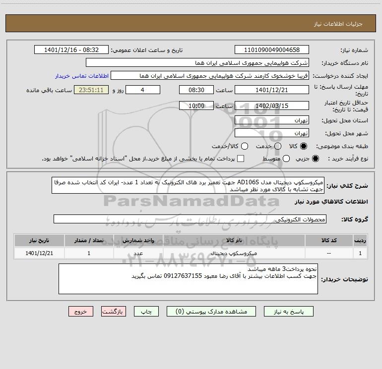 شرح کلی نیاز: میکروسکوپ دیجیتال مدل AD106S جهت تعمیر برد های الکترونیک به تعداد 1 عدد- ایران کد انتخاب شده صرفا جهت تشابه با کالای مورد نظر میباشد