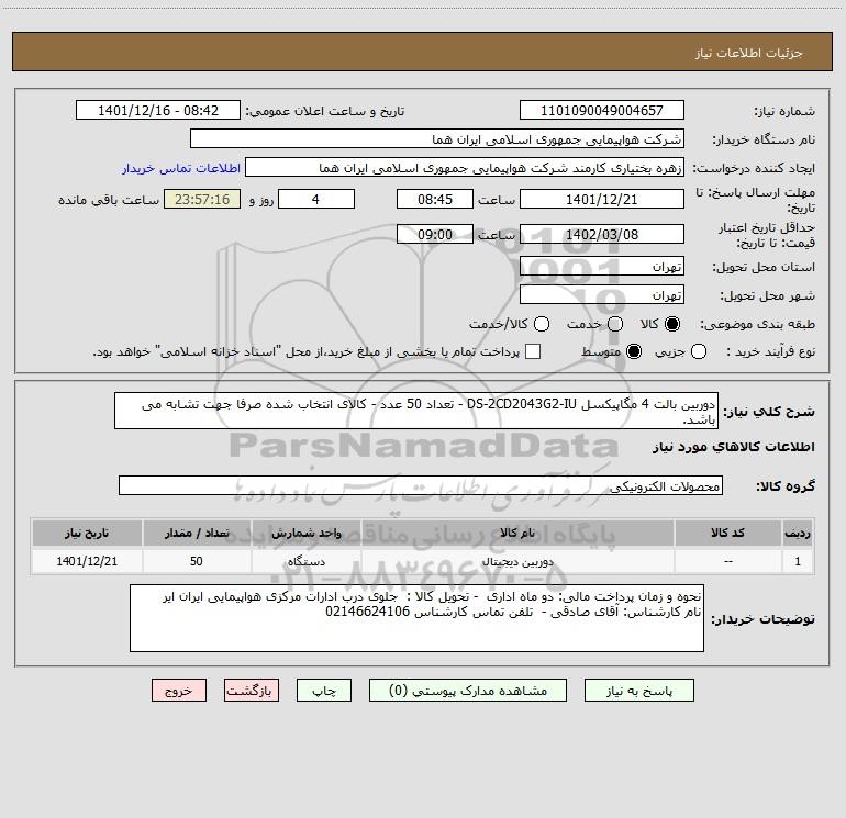 شرح کلی نیاز: دوربین بالت 4 مگاپیکسل DS-2CD2043G2-IU - تعداد 50 عدد - کالای انتخاب شده صرفا جهت تشابه می باشد.
