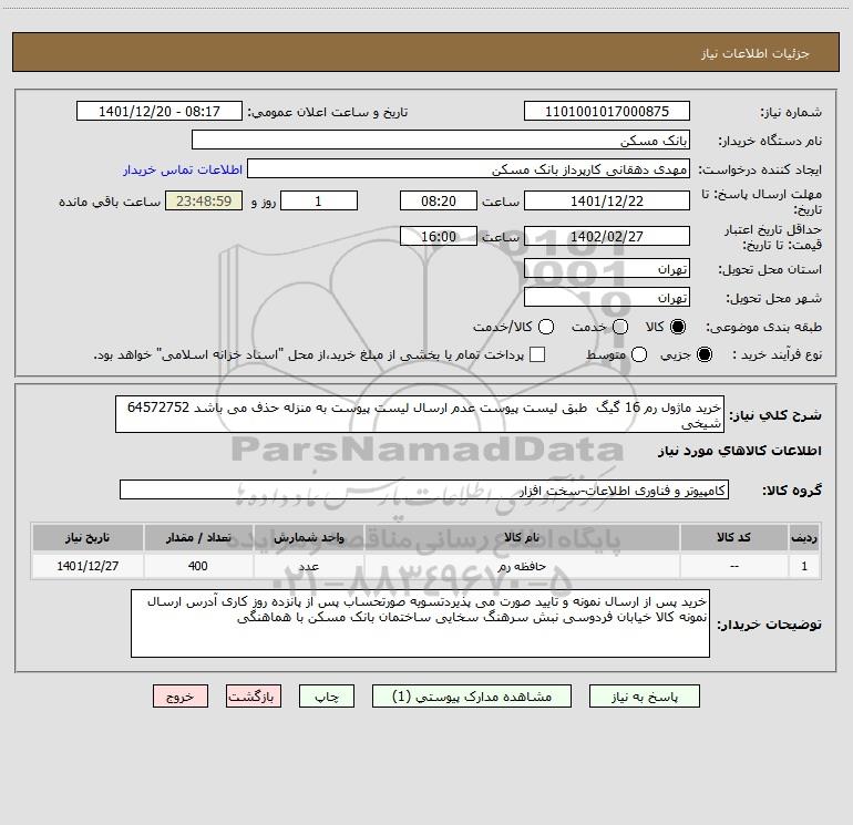 شرح کلی نیاز: خرید ماژول رم 16 گیگ طبق لیست پیوست عدم ارسال لیست پیوست به منزله حذف می باشد 64572752 شیخی