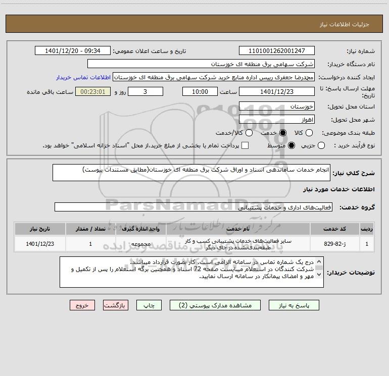 شرح کلی نیاز: انجام خدمات ساماندهی اسناد و اوراق شرکت برق منطقه ای خوزستان(مطابق مستندات پیوست)