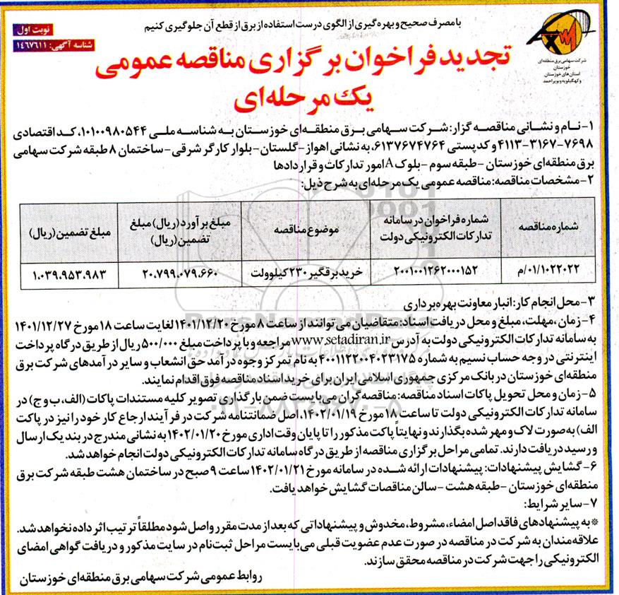 | 1022022/ 01 / م | 2001001262000152 | خرید برقگیر 230 کیلوولت | 20.799.079.660 | 1.039.953.983 |