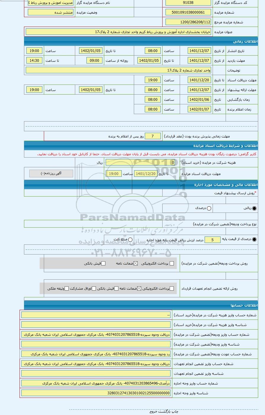 | شماره مورد اجاره | 5101091038000061 | نوع برگزاری مزایده | مزایده عمومی | |