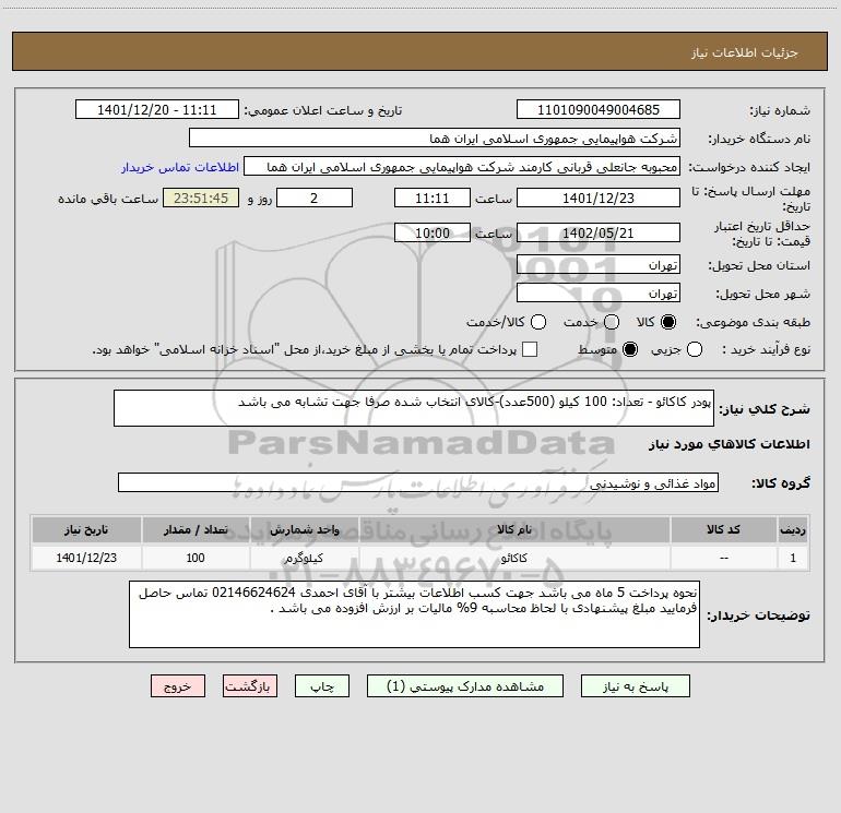 شرح کلی نیاز: پودر کاکائو - تعداد: 100 کیلو (500عدد)-کالای انتخاب شده صرفا جهت تشابه می باشد