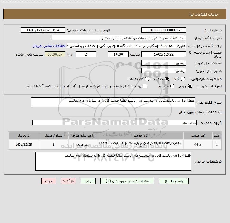 استعلام فقط اجرا می باشد.فایل به پیوست می باشد.لطفا قیمت کل را در سامانه درج نمایید., استعلام فقط اجرا می باشد.فایل به پیوست می باشد.لطفا قیمت کل را در سامانه درج نمایید.