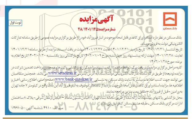 بانک مسکن در نظر دارد اسناد و اوراق کاغذی قابل امحاء موجود در انبار فیروزآباد خود را از طریق مزایده عمومی از طریق سامانه تدارکات الکترونیکی دولت به فروش برساند