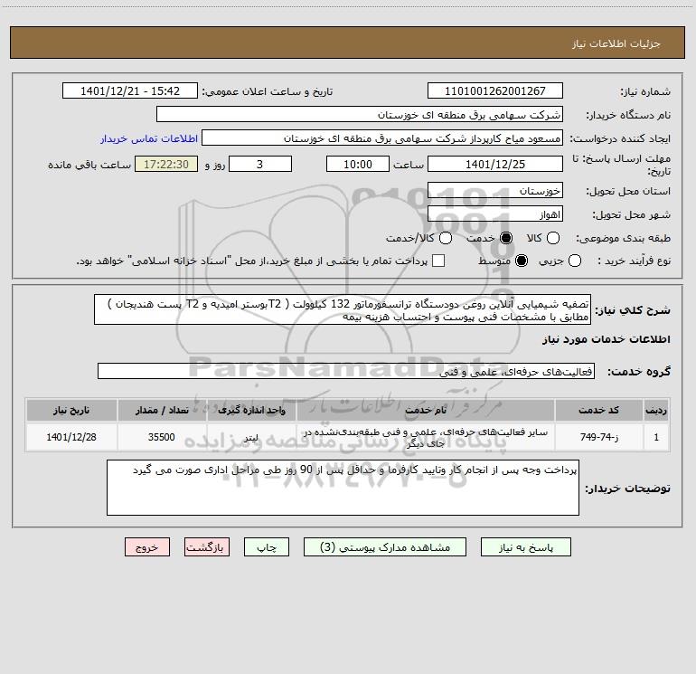 شرح کلی نیاز: تصفیه شیمیایی آنلاین روغن دودستگاه ترانسفورماتور 132 کیلوولت ( T2بوستر امیدیه و T2 پست هندیجان ) مطابق با مشخصات فنی پیوست و احتساب هزینه بیمه