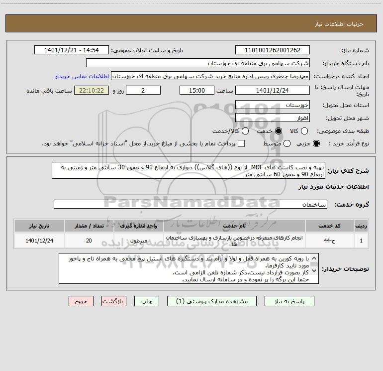 شرح کلی نیاز: تهیه و نصب کابینت های MDF از نوع ((های گلاس)) دیواری به ارتفاع 90 و عمق 30 سانتی متر و زمینی به ارتفاع 90 و عمق 60 سانتی متر