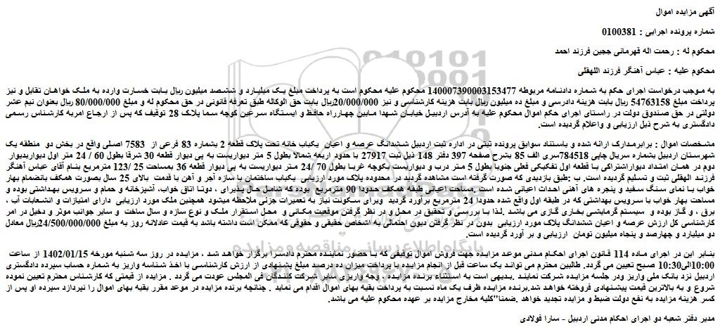 به موجب درخواست اجرای حکم به شماره دادنامه مربوطه 140007390003153477 محکوم علیه محکوم است به پرداخت مبلغ یک میلیارد و ششصد میلیون ریال بابت خسارت وارده به ملک خواهان تقابل و نیز پرداخت مبلغ 54763158 ریال بابت هزینه دادرسی و مبلغ ده میلیون ریال بابت هزینه کارشناسی و نیز 20/000/000ریال بابت حق الوکاله طبق تعرفه قانونی در حق محکوم له و مبلغ 80/000/000 ریال بعنوان نیم عشر دولتی در حق صندوق دولت در راستای اجرای حکم اموال محکوم علیه به آدرس اردبیل خیابان شهدا مابین چهارراه حافظ و ایستگاه سرعین کوچه سما پلاک 28 توقیف که پس از ارجاع امربه کارشناس رسمی دادگستری به شرح ذیل ارزیابی و واعلام گردیده است.