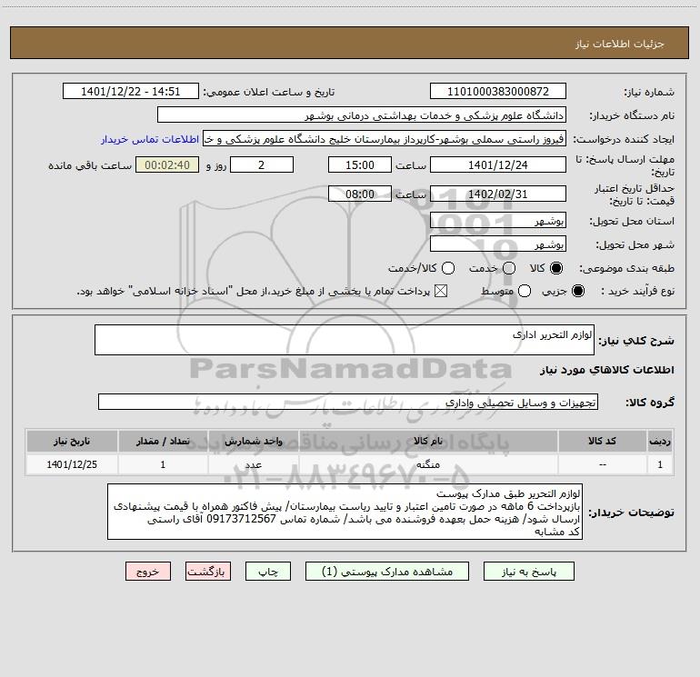 توضیحات خریدار:لوازم التحریر طبق مدارک پیوست بازپرداخت 6 ماهه در صورت تامین اعتبار و تایید ریاست بیمارستان/ پیش فاکتور همراه با قیمت پیشنهادی ارسال شود/ هزینه حمل بعهده فروشنده می باشد/ شماره تماس 09173712567 آقای راستی کد مشابه